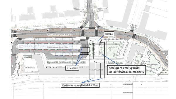 A mélygarázzsal együtt a tervezett autóbusz állomást is kiszolgálhatná az aluljáró, így az utasoknak nem kellene szintben keresztezniük az autóbuszforgalmat és az állomásépületen főcsarnokát sem kéne érinteniük. A tervek szerint kialakítandó parkosított terület alatt komolyabb nehézségek nélkül elférne egy 500 kerékpár tárolására alkalmas mélygarázs, amennyiben tényleg csak a legegyszerűbb konfigurációt alkalmazzák.