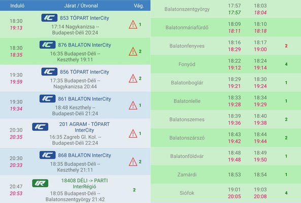 Kedd délután rendesen rájárt a rúd a Balaton környéki vonatközlekedésre. Délelőtt Lengyeltótinál kisiklott egy motorvonat, míg délután mozdonyhiba miatt megdöglött egy Balaton Intercity. Érdekesség, hogy nem egy fél évszázados V43-as típus adta meg magát, hanem egy viszonylag fiatalnak számító korszerű TRAXX mozdony. Arra, hogy ilyenkor mennyire borul a vonal menetrendje, ez a Balatonboglár állomás érkező vonatairól készült képernyőfotó a legjobb illusztáció: