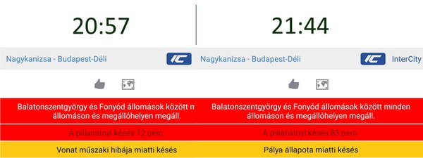 Mindezekre jön még rá a szemből érkező vonatok késése és az utasforgalmi ok, ennyi fennakadás ismeretében nem is meglepő, hogy hogy tud egy vonat ennyit késni. Érdekes viszont, hogy a késés indoklása Székesfehérvár után a műszaki hiba helyett pályaállapotra változott.