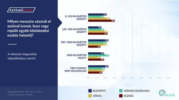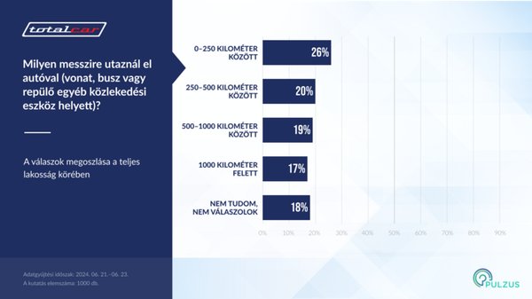 Nem olyan egyszerű a komolyabb távolságokra mostanában "tömegközlekedési" megoldást választani. A repülés az utóbbi napokban, hetekben minimum macerás a járatkésések miatt. Miközben a vonatok egy részén vállalhatatlan meleg van, annyira, hogy a MÁV konkrétan buszozásra buzdította az utasokat, a másik fele pedig már-már üzemszerűen késik. Persze ott van opciónak az autó, akinek van vagy hozzá tud jutni. A hosszú távú utakkal járó kényelmetlenség, a repüléshez mért időhátrány és a magas üzemanyagárak miatt kérdés, ki, mekkora távolságot vállal be autóval. Erre kereste a választ a Totalcar a Pulzus Kutató segítségével.