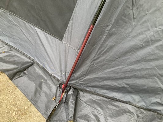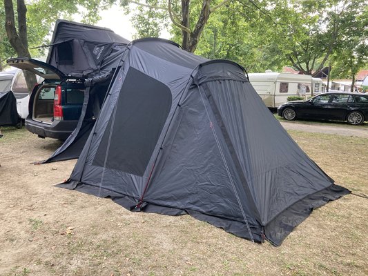 A felállítás után látszott, hogy kicsit magasabb járműhöz készült (régebben volt többféle méret, de most, amennyire tudom, csak ez van), a Volvonak hiányzik még olyan 10-15 centi, hogy a csatlakozó elem szépen álljon. Ez nem okoz gondot, de eső esetén nem árt figyelni, megállhat a víz a hajlatokban. A többi rész viszont áll mint a cövek, és ennek is köszönhető az a kellemes tulajdonsága a sátornak, hogy le lehet csatolni a tetősátorról és akkor se esik össze, ott lehet hagyni a kempingben mondjuk.