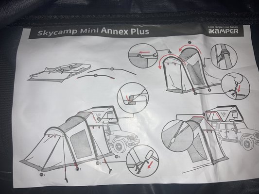 És megérkeztünk a fullos megoldáshoz, az elősátorhoz. Ez már tényleg egy sokszemélyes sátor méreteivel rendelkezik, nálam alapból a tetősátor ponyvájához rögzül, így gyakorlatilag egy teret képezve azzal. Amikor kiterítettem, olyan amorf formát kaptam, hogy elsőre azt se tudtam, melyik az eleje. Nem bonyolították túl a kézikönyvet, egy cetli a sátor tokjának belsején, négy ábrával.