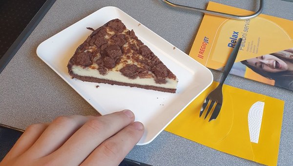 Az utazás zökkenőmentes volt, a személyzet időnként megkérdezte, hogy kívánunk-e fogyasztani valamit. Megnéztük mi van és mennyiért, aztán arra jutottunk, hogy hülyék lennénk kihagyni. A Regiojet az a hely, ahol 2000 forintért levessel, főétellel, desszerttel megebédelsz. Nyilván nem a helyi séf üti össze a kaját a vonaton, cseh dobozolt cateringes ételekról van szó, de akkor is kellemes meglepetés az árdimenzió. A közönségkedvenc a 150 forintos (!) tortaszelet, amely akkora, hogy bármelyik pesti cukrászdának lenne képe egy ezrest is elkérni érte.