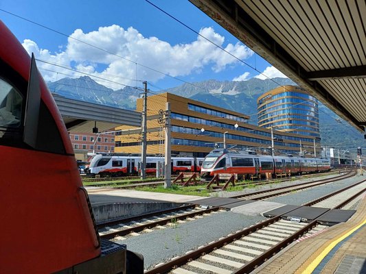 Az új Railjet végül 10 perces késéssel érkezett Innsbruckba, de így is simán elértük a csatlakozásunkat, ami egy Bregenz-Bécs Repülőtér viszonylatú első generációs Railjet volt, épp olyan, ami hozzánk is jár, még a feliratok is magyarul voltak rajta. Érdekesség, hogy az út Innsbruckból Bécsbe Németország csücskén át vezet, ám mivel a vonat Németországon belül sehol sem áll meg, ugyanúgy belföldi viszonylatnak tekintendő. Ezen a vonaton is rengetegen voltak, a helyfoglalás nagy előny volt, sokan végigállták az Innsbruck és Bécs közötti több, mint 4 órás utat. Bár Salzburgig összeszedett a vonat némi késést, ezt már Linzig behozta, sőt Bécs főpályaudvarára 3 perccel korábban érkezett.