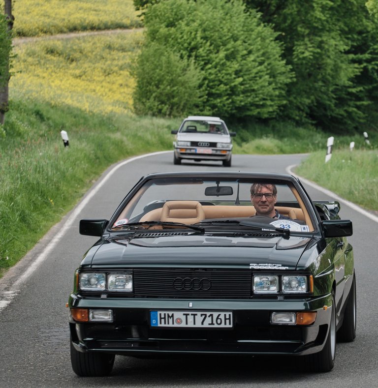 Mivel vezető és utasa alacsonyan ül a kocsiban, a hajukat országúti tempónál és autópályán sem tépi a szél. Simán el tudom képzelni, hogy hosszabb utakat is meg lehet vele tenni az Autobahnon, akár nagyobb tempóval is, nyitott tetővel. Ebben esetleg egy dolog lehet zavaró, az, hogy miközben a fordulatszámmal arányosan az erő és a sebesség is egyre nő, az öthengeres jellegzetes zenéje is egyre túlkiabálhatatlanul szól, meg persze nagyon rohanva vele megjön a szélzaj is. Cserébe viszont ez a 250 lóerős már simán tartja a lépést a korabeli Porschékkal. Hajtottunk együtt, egyikkel sem volt egyszerű meglépni a másik elől. Szóval, teljesen megértem Walter koncepcióját. De, mivel mentem hosszabb kört Treser saját, csupán kétszáz lóerős kocsijával is, szerintem az is bőven elég. Már az is meglepően folyamatosan és szépen építi fel a turbónyomást – vezettem rövid, gyári Sport quattro-t is, az ennél sokkal, de sokkal brutálisabban indul meg, arra nagyon figyelni kell. Szóval ha ott állnék, s alá kellene írnom a megrendelőlapot, én megspórolnám a plusz lóerők vaskos felárát. De ez a kérdés erősen elméleti. Újként a kocsi ugye elérhetetlenül drága volt, használtan pedig nem létezik. Földi halandó sohasem jut el oda, hogy válogathasson az eladó quattro roadsterek között. Egy nagyon-nagyon szűk kör tagjai között mozognak ezek az autók, ha esetleg tulajdonosváltás történik. Ezért a legtöbbünk maximum kiállításokon láthatja őket, kívülről, a kordon mögött. De, annyira jó érzés tudni, hogy léteznek - köszönjük Walter!