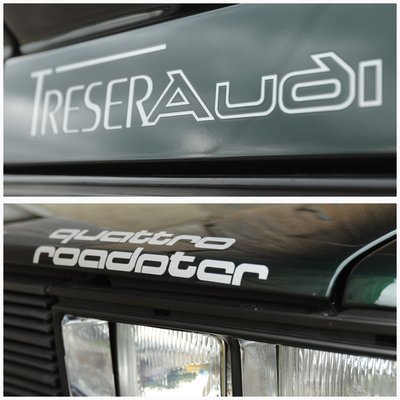 Persze, a négy karika alatt, azon a lökhárítón, amely Walter Treser tervei alapján készült, ott van már egy picike embléma, ami az autós világ már mélyebb bugyraiban is alámerülteknek elárulja, hogy egy igen ritka járművel állnak szemben – mégpedig egy Treser Audi quattro roadsterrel. Igen, a név így írandó helyesen, a q és az r betű is kicsi benne. A quattro-t az Audi mindig is kis betűvel írta, rákérdeztem náluk, ez biztos. A biztonság kedvéért a kocsi nevét a bal első fényszóró fölé is odaragasztották. A legyártott 29 darabból ez a T70016-os alvázszámú, de nem a tizenhatodik, annál korábbi.
