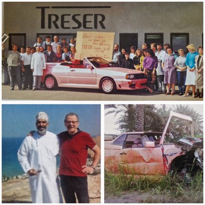 Közben megismerték a kocsi történetét is. A roadstert ugye az 1983-as frankfurti IAA-n mutatták be. Ezt az autót a Walter Treser GmbH egyedileg építette Robert Streich úrnak. Módosítottak rajta a váltón, töltőlevegő hűtőt kapott, távirányítós garázskapunyitót szereltek be, s megrendelte a Turbo kerekeket is rá a spéci kormánykerék, az első-hátsó lökhárító mellé. Ja, s természetesen a beltér színe is egyedi – barna/bézs kombináció, Treser logós szövettel. Az 1984 július végén kiszállított kocsi árának végösszege 187.257 DM-re rúgott. Csak, hogy érezzük a helyzet komolyságát, ezért a pénzért akkor egy Porsche 911 Turbo-t és egy 928 S-t adtak – a kettőt együtt, vagyis mindegyikből 1-1 darabot! Sőt, valójában e két kocsi is „csupán” 186.950 márkába került. Vagy, ha „mégis az Auditól” választott volna valami mást, akkor adtak volna érte 5,5 darab – ekkor az Audi-NSU által Neckarsulmban gyártott – alap Porsche 924-est... Csak, hogy érzeni lehessen, milyen árszínvonalra pozícionálta Streich úr a kocsiját. Egyszerűen elérhetetlenül drága volt a Treser-féle quattro roadster... A kocsit később eladták a következő tulajdonosnak, aki 74.230 kilométeres futásteljesítménynél leállította, hogy újra fesse. „Közben kikerült belőle a Spezialmotor – volt vele valami gubanc, de nem bírták megjavítani. Majd a motornélküli karosszéria véletlenül valami agyagos árokba csúszott, ott megsérült az eleje. Ezután darabokra szedték, az alkatrészek feliratozott dobozokba és zacskókba kerültek, majd az összes elemet egy negyvenlábas konténerbe rámolták, s ahogy az lenni szokott, úgy felejtődött el az egész, évtizedekre – illetve egészen pontosan 9.673 napra. Tehát szétszerelt állapotában az autó 26,5 évig pihent egy 40 láb hosszúságú konténerben. Ti elhinnétek ezt?! Akkor került ismét elő, amikor engem értesítettek róla. Amikor ott álltunk mellette, a tulajdonos elővett egy újságot is, s mutatott benne egy cikket nekem, büszkén: ezen a képen itt áll maga Walter Treser a kocsim mellett, ő építette ezt! Treserrel ekkor egymásra vigyorogtunk, s annyiban hagytuk a dolgot. Ezután négy óra alkudozás következett, majd miután aláírtuk a szerződést, elhoztam.