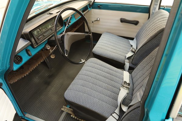 Ha már borítások, ennek a kormányközepe még puha, nem kemény műanyagból készült. A korai szériák ajtó kédere fehér volt, de azt sajnos már nem tudtuk megmenteni. Az első széria sajátossága ez a gumiszőnyeg is, később Wartburg feliratosra cserélték le ezt. Ebben a kocsiban még úgynevezett „taposós” a gázpedál, a kuplung és a fékpedált ugyanúgy kell nyomni, mint a fiatalabbakban.” Ezen Ferenc szerint szintén a hetvenes években változtattak.