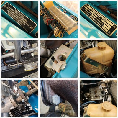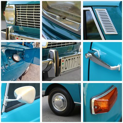 Az első irányjelzője is más ennek a korai kivitelnek, mint a későbbieknek. A szofita izzós világítótest ugyanis nem türemkedik be a karosszériába, azzal sík a síkon illeszkedik, ez az eredeti gyári kialakítása. Eltér az is, hogy a kilincsei még a korai szériákra jellemzőek, illetve a zárban a kulcs nem 90, hanem 180 fokot fordul, így nyitott és zárt állásban is függőlegesen áll. A géptető kitámasztó pálcát – szemben a későbbi megoldással, ahol az a géptérben van – itt még a tűzfalról kell felpattintani, majd ráengedni a géptetőt. Mivel ezen még a homlokfalon van a kitámasztó pálca, amikor leveszem a homlokfalat – mondjuk a gyújtás állításához le kell – azzal együtt megy a kitámasztó pálca is. Így nincs mivel kitámasztani a géptetőt, amíg a későbbi szériákban a motorháztetőről nyílt le, s így ilyenkor az ott marad és a hengerfejre vagy a hűtőre ki lehet támasztani. Legutóbb egyébként az egyik kondenzátor nem működött, azt kellett kicserélnem végül. A deluxe-ban egyébként két duda van, ebben csupán egy.