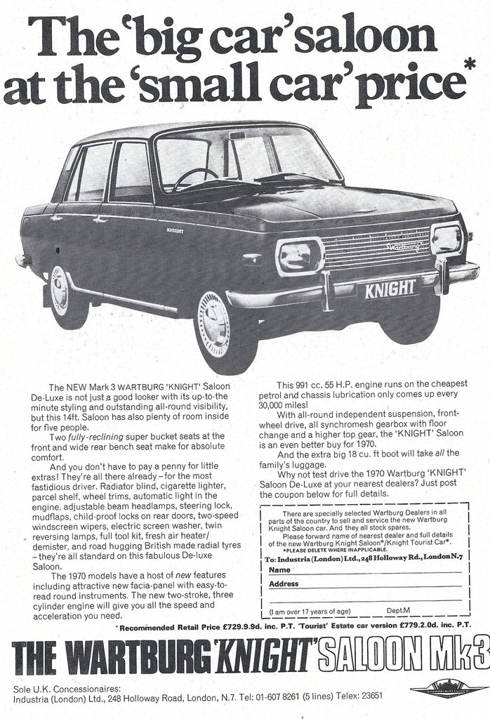 Részben ezért sem jutott/maradt sok a DDR polgárainak –, ráadásul közben a Wartburg átlépte a vasfüggönyt is, s készültek belőle jobbkormányosok is. Farty – vagyis fingós – Hansnak csúfolták Angliában s Wartburg Knight néven árusították. Tökéletes volt a különcöknek. A helyi prospektus szavaival élve: „Íme egy masszív családi autó, amelynek karosszériája a modern stílus csúcsa, erős merev alvázra szerelve.” A szigetországban egy árban volt a Moszkvics 412-vel, s kicsivel kértek többet érte, mint egy Mini 1000-ért. Az 1970-es években el is adtak vagy húszezret belőle, de utána szigorodtak a károsanyag kibocsájtásra vonatkozó paragrafusok, s vége lett a sikernek.