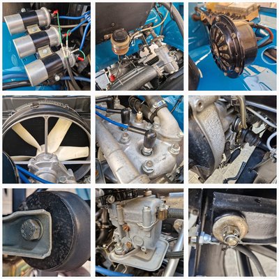 A ventilátor lapát a korai kocsikon még hat lapátos, később négyre váltottak” – mesél folyamatosan a kocsi részleteiről Ferenc, büszkén. Majd közbevágok, hogy a hűtőradiátor és a ventilátor alumínium háza közötti műbőr bizony szakadt! Frappáns választ kapok, csípőből tüzelve: „igen, de ez a sajátja!” Ez a bőr lebernyeg egyébként a hatlapátos rendszerrel szereltek sajátja, erősebb rugó kellene, de valahogy mindig lecsúszik róla, s nem feszíti kellőképpen a bőrt – magyarázza a tulajdonos. Két- vagy négyszemély állása van a fényszórónak, egy karral állítható elöl, a foncsor mozog a fényszóró testben. A kormánytól balra, alul a bal oldali a hűtőzsalu mozgató rugója, a géptető nyitó mellett, s van a kormányoszlopra szerelt kapcsolója a szabadonfutónak is. „Ha esetleg, mint korai szériás jellemzőt meg akarod említeni, leírhatod, hogy a motorháztető nyitója itt függőlegesen áll még (mint ahogy a púposokban is), amíg a későbbiekben már vízszintesen van” – teszi hozzá.