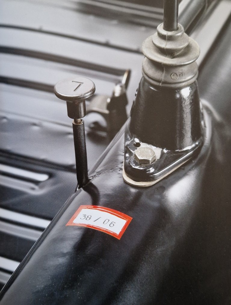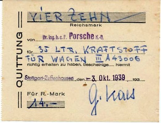 Ugye fel sem merül, hogy hamisítvány? Természetesen eredeti. 1939. október 3-án, Stuttgart-Zuffenhausenben a Porsche gyár által kiállított bizonylat 14 birodalmi márkáról szól a IIIA-43006 rendszámú kocsihoz, amelyben 35 liter üzemanyagról van szó. A nyugtát G. Kaes írta alá. Csak annyit, hogy ez a Ghislaine E. J. Kaes, Ferdinand Porsche magántitkára volt. Ferdinand Porsche Ferry fiával és unokaöccse, Kaes társaságában utazott a másik két GEZUVOR igazgatóval – Bodo Lafferentzzel (1897-1974) és Jakob Werlinnal (1886-1965) – tanulmányútra az USA-ba, hogy gyártási szakembereket toborozzon a gyárba. A háborús években – ugye a második világháború szeptember 1-jén tört ki – az üzemanyag használatot korlátozták, s a VW 38-asok speciális tankolási engedélyekkel rendelkeztek, amit a rendszámtábla piros V-betűje jelezne – de, ez ezen a kocsin (még) nincs rajta. A csalások megelőzése érdekében vezették be a Német Birodalomban ezt a szigorú, háborús helyzetekben alkalmazott üzemanyagvételezési rendszert.