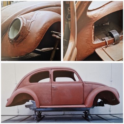 Az elejéből alig maradt valami menthető, csak az egyik burkolatlemez és a csomagtartó fedelének felső része maradt, a pótkeréktartó, illetve minden újra el lett készítve. A sárvédők menthetőek lettek volna, de láss csodát, egy barátuk Wolfsburgban talált egy tökéletes pár, korabeli sárvédőt az interneten, amin csupán a fényszórók körül kellett alakítani! A Bogár hátuljával több szerencséjük volt, a felcsavarozott fémlemezek nagyrésze megmaradhatott.