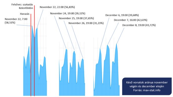 A MÁV hivatalosan ugyan nem közöl részletesen adatokat, azonban van egy oldal, amely ezt megteszi. A MÁV-stat.info oldalon követhetjük az elmúlt egy év késési adatait, akár óránkénti bontásban. A November 22-ei havazás, mint fekete nap a következőképp néz ki néhány másik átlagnál valamivel rosszabb nap grafikonjával összevetve.