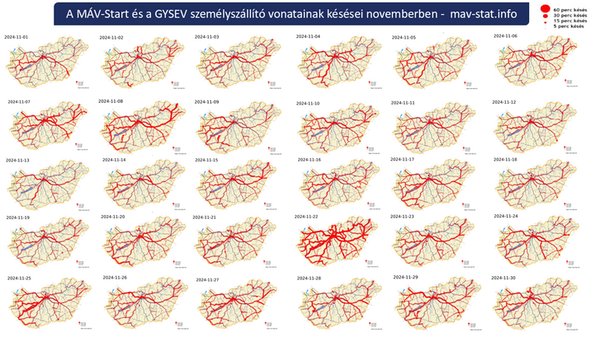 Az ország novemberi problématérképére nézve súlyosan kiemelkedik a november 22, ám a 30 térképet egymás mellé téve fel lehet fedezni bizonyos mintázatokat. Az országos fővonalak esetén ez különösen jelentősek a késések, illetve azok gyakorisága