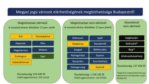 Magyarországon tehát a 25 megyei jogú városból csak kilenc érhető el úgy közvetlenül vonattal, hogy ne kelljen stabilan legalább 15-20 perces vagy afölötti késésre számítani. Másik 12 város csak átlagosan 20 perc késéssel érhető el, ezek közül néhányból pedig már buszközlekedés sincs a fővárosba, a párhuzamosságok felszámolása okán.