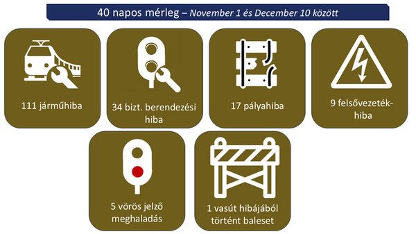 Jelen módszertan alapján a november elseje és december tizedike közötti 40 napban összesen 111 járműhiba, 34 biztosítóberendezési hiba, 17 pályahiba és 9 felsővezetéki hiba lassította vagy akadályozta a vasúti közlekedést a MÁV hálózatán. A táblázatot megtekinteni itt lehet.