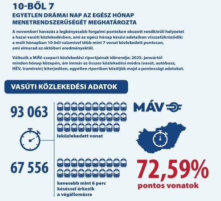 A MÁV 2024 szeptemberéig vonatnemenként publikálta a járatok pontosságát. Mivel augusztusra az IC-k pontossága annyira alacsonyra süllyedt – kevesebb, mint három vonat késett hat percnél kevesebbet – a MÁV vezetése átalakította a késési statisztikák közlését. Az új rendszerben egy havi riport című videósorozatot készítettek, amelyben többé nem osztják kategóriákra a vonatok pontosságát, a négy megállót közlekedő elővárosi vonat ugyanannyira számít bele az adatokba, mint a többszáz kilométert megtevő Intercityk. A mostani statisztikák szerint novemberben a vonatok 72,59 százaléka volt pontos. Mivel csak azokat a számokat tudjuk összehasonlítani, amiket megkapunk, ez azt jelenti, hogy a menetrendszerűség nagyjából ugyanolyan volt, mint a 72,43 százalékos, mindenkori rekord augusztusban. A leközlekedtetett vonatokat súlyozva az augusztusi késési adatokkal, nagyjából megkaphatnánk ugyan, hogy mennyit késhettek a vonatok vonatnemek szerint novemberben. Persze a statisztikák torzításában járatosak láthatják, hogy az államvasút elegánsan csupán néhány fontosabb vonatnemben indított vonatok számát közli, hogy elkerülje ezt a lehetőséget.