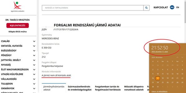 Dénes nevű olvasónk még 2023 tavaszán vásárolt magának egy Mercedes-Benz E350 CGI-t. Az autó 2018 óta rója a magyar utakat, ez idő alatt háromszor esett át eredetiségvizsgán és négyszer műszakin. Ha bármi probléma lett volna vele, alighanem jelezték volna már a hatóságok valamelyik alkalommal. Vásárlás előtt Dénes a Járműszolgáltatási Platform adatbázisában is ellenőrizte a kocsit, ahol minden rendben találtatott. Sőt, az állami nyilvántartás szerint a helyzet a mai napig változatlan.