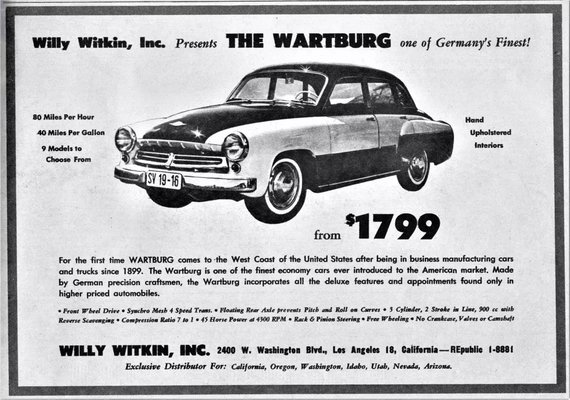 A Wartburgot az USÁ-ba is exportálta egy Willy Witkin nevű, kaliforniai székhelyű vállalkozás. A kocsit Németország egyik legjobbjaként hirdették, amit precíz német szakmunkások állítanak elő. Arról, hogy a kocsi egy szocialista ország terméke volt, nem ejtettek szót – valahol azt olvastam, hogy 1303 darabot adtak el belőle az Államokban.