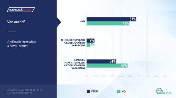 A felmérés első kérdése azt volt, hogy kinek van autója. A lakosság valamivel több mint fele rendelkezik autóval. Emellett 40 százalékos azoknak az aránya, akiknek nincs és nem is szeretnének. Mindössze 6 százalékuk szeretne belépni az autósok táborába.