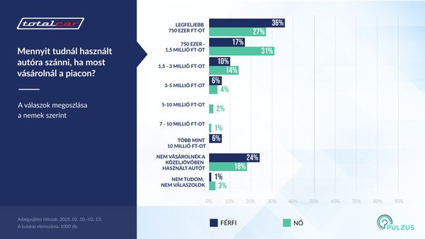 Az alsó árkategóriákban jelentős különbségek vannak a nemek szerinti bontás alapján. Miközben a nők 31 százaléka választana a 750 ezer és 1,5 millió forintos sávból, a férfiaknak csak a 17 százaléka. Ugyanakkor a 750 ezer forint alatt ligában a férfiak 36 százaléka keresgélne, a nők arány itt viszont csak 27 százalékos.