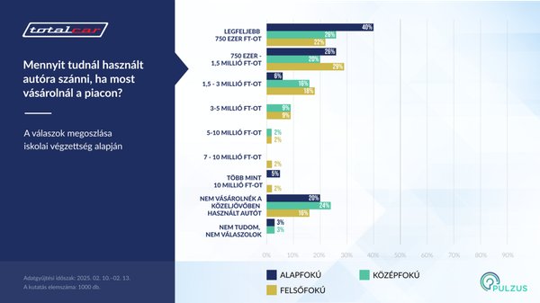 A legfiatalabbak, azaz a 18-39 évesek kevesebb mint ötöde mondana le az autóvásárlásról. A 60 felettieknél majdnem kétszer ekkora az arány. A középkorúaknak pedig az ötöde mondta azt, hogy nem szeretne autót. Bár a diplomások magasabb átlagjövedelemmel rendelkeznek, ez nem feltétlenül tükröződik az adatokban. A körükben is többségben vannak a 1,5 millió forint alatti autókat preferálók száma, egészen pontosan 51 százalékos.