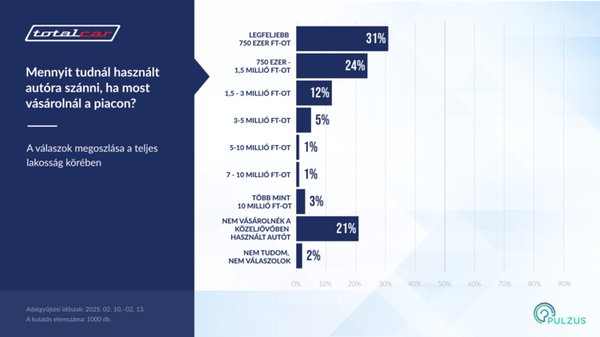 A Totalcar megbízásából a Pulzus Kutató által készített reprezentatív felmérés alapján is várni kell még arra, hogy rövid távon jelentősen csökkenjen az autók átlagéletkora. Egyrészt azért, mert a megkérdezettek 42 százalékának most sincs autója és nem is tervezi a beszerzést. Másrészt a megkérdezettek 31 százaléka maximum 750 ezer forintot tudna vásárlásra szánni, ha most kellene lépnie.