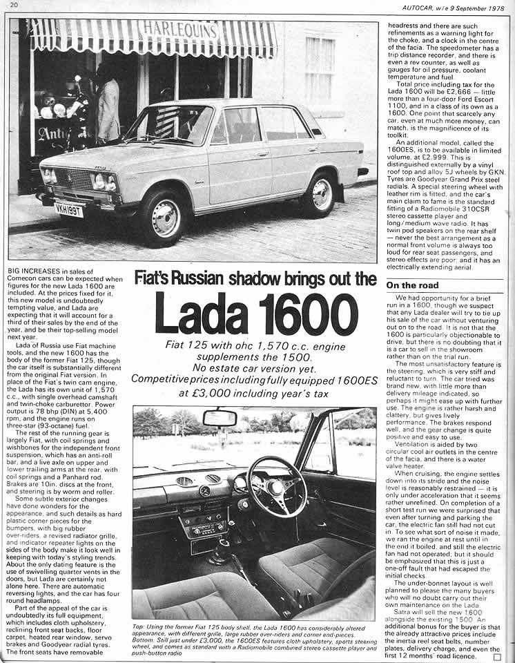 No, amikor ez az új Lada 1600-as megjelent – amely az 1972-ben bemutatott 2103-as magasabb polcra emelt csúcsváltozata – egy egyoldalas, az angol AUTOCAR lapban megjelent bemutatóban 1978-ban azt prognosztizálták, hogy a márka értékesítésének fellendülése várható, s a kétségkívül csábító új modell a Lada várakozásai szerint eladásaiknak egyharmadát teszi majd ki, sőt, elképzelhető, hogy a legkelendőbb modelljük lesz.