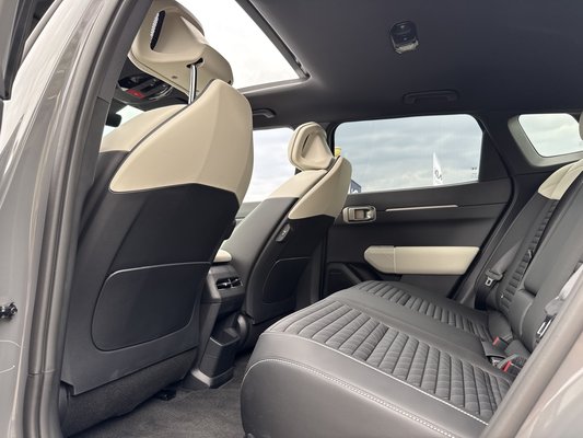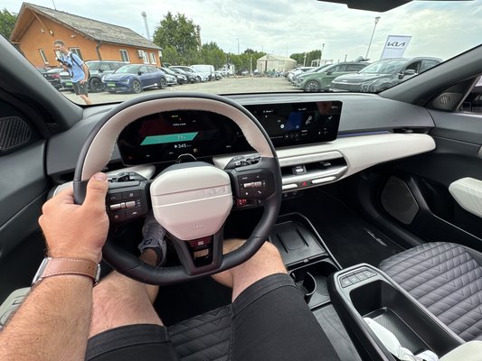 Belső elrendezés szempontjából az EV3-ban megismert logika folytatódik: természetesen rengeteg kijelzőfelület uralja a műszerfalat, 12,3 hüvelykes kijelzők vannak a sofőr előtt és középen is, a kettő között pedig a klímaszabályzók kaptak helyet. Jó hír, hogy a gyakran használt menügomboknak és a hangerőállításnak külön gombja maradt, ahogy a kormányon lévő gombok és tekerők is hagyományosak.