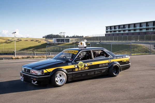 A drifttaxi nem egy újkeletű dolog, rengetegen építenek erre az élményre, köztük Mad Mike is, csak ő tényleg egy taxiból csinált drifttaxit. A HC Mazda Luce a japán gyártó nagy méretű prémium szedánja volt, amit '86 és '91 között gyártottak mindenkinek, utána viszont egészen '96-ig taxinak lehetett megvenni Japánban. A Luce gyárilag is kapható volt 13B Wankel motorral, de Mike-ék egy 3 literes V6-os modellt szereztek, amiből természetesen egyből kidobták motort.