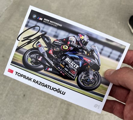 A legnagyobb tömeg a sportág jelenlegi sztárjánál, Toprak Razgatlıoğlunál volt, aki jelenleg épp vezeti a világbajnokságot. Toprak 407 ponttal áll az élen a BMW-vel, szorosan követi őt Nicolò Bulega, aki eddig 381 pontot gyűjtött a Ducatival. Egy aláírást sikerült zsákolnom Razgatlıoğlutól, ez egy kedves barátomnál landolt, aki nagyon kedveli a török pilótát.