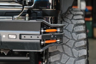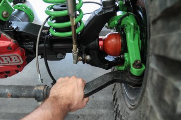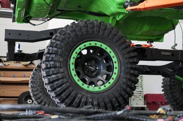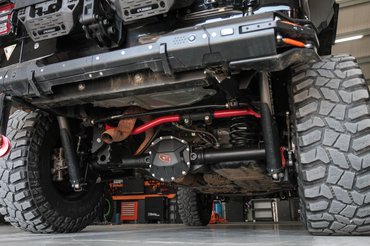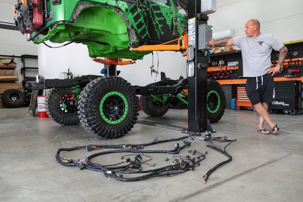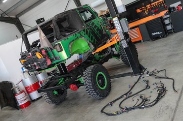 Teljesen új kábelköteg készült hozzá csatlakozókkal együtt. Az új kormányösszekötők vastagabbak, mint a csuklóm, a kormánystabilizátor meg mint az alkarom, mégis egy kézzel könnyen elbírom, mert alumínium az egész. Óriási meló ez bármilyen autónál, de itt még az alkatrészek méretei is megdöbbentőek. Egyik tengely sem a gyári már, rugók, lengéscsillapítók, futómű elemek, stabilizátorok, lökhárítók és a sok sok kiegészítő mind-mind utólagos átalakítás és extra.