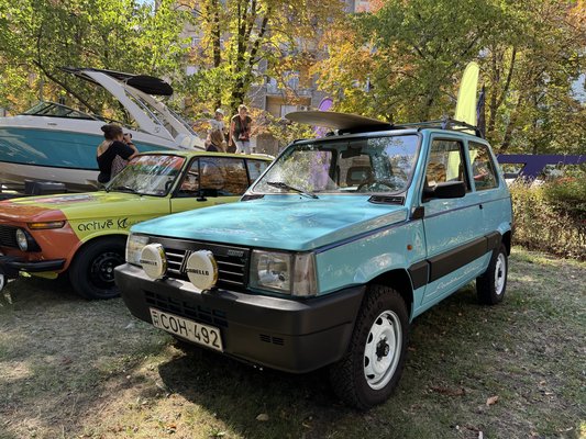 A központi helyen állva azonnal feltűnt egy nem kiemelkedően értékes, nem is eredeti, ám nagyon karakteres autó, egy Fiat Panda. Tulajdonosa, Bence mesélt nekem az autó történetéről: természetesen Olaszországban fertőződött meg a típussal, ahol az egykori népautóból a mai napig rengeteget lehet látni, és az olaszok nemzeti kincsként is kezelik. Olyannyira szó szerint kell ezt érteni, hogy bár egész sok jó állapotú, kedvező árú Pandát talált kinn, a helyiek nem akarták neki eladni úgy, hogy elviszi az országból az autót, így aztán muszáj volt a hazai, jóval szűkebb kínálatra hagyatkozni, de így is talált egyet.