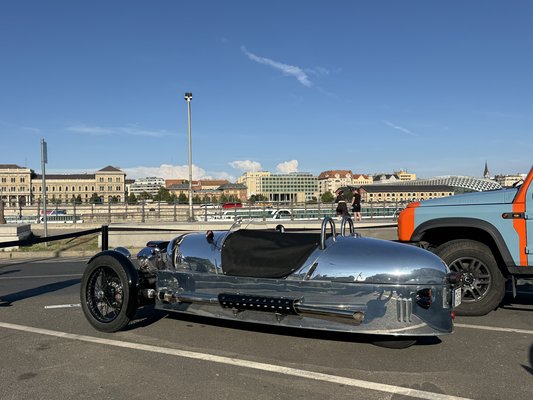 Azt hiszem, erre gondolhattak a szervezők Modern Heritage kategória alatt. Ez a háromkerekű Morgan 2020-as gyártású, és bár kétliteres benzinmotorja van, papíron nem túl erős, mindössze 70 lóerő, cserébe 585 kiló a saját tömege, szivar formájával pedig az egyik legfotogénebb autó volt a rakparton.
