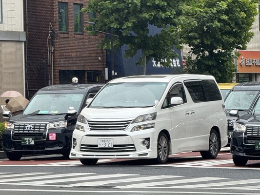 Tele a város Crown taxikkal mindenhol, Kiotóban a fekete és a fehér alapon rozsdabarna ajtós változatok mennek, Nagojában a legtöbb fehér, Tokióban pedig visszatér a fekete. Itt érdekes pont a fehér új Crown taxi flotta, amik között az ültetés és a nagy felni sem ritka, miközben utasokat szállítanak. Minden Crown Royal és Toyota Comfort taxiban közös a kihúzott háttal, fehér kesztyűben és kalapban vezető büszke sofőr, igazi hivatás ez. Már egészen elterjedt az új, 2017-ben bemutatott Toyota JPN Taxi is, ami messziről erősen hajaz a londoni taxikra, de azoknál még ortopédabb. A Crownok eleganciájából a sárvédőkre épített tükrökön túl mást nem igazán örökölt. A kormány által előírtak alapján készült: alacsonypadlós, akadálymentes beszállás, elektromos tolóajtó, LPG-vel etetett hibrid hajtás. Nem néz ki jól, de utasként biztosan kényelmes.