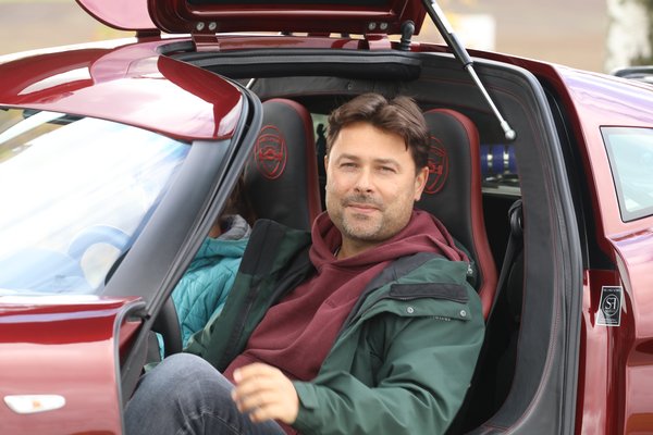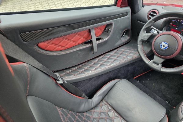 Szóval, a kattintgatás után alaposan szemügyre vettem. Döbbenetesen picike, méretre akkora, mint egy MX-5-ös, csak még kisebbnek érződik, mivel laposabb, s tényleg le kell guggolni hozzá, hogy bejuthass a kabinjába. Ha a szárnyasajtó nem harapna ki a tetőből, magamfajta méretű – 183 centiméter vagyok és 90 kilogramm – embernek képtelenség lenne beleülni. Lábak előre, miközben a széles küszöbön támaszkodsz, becsusszansz a kabinba, s a feneked is a helyére kerül az ülésben. Mozgástér lényegében nincs, s ha magamra húzom az ajtót, még inkább romlik a térérzet. A fejem lényegében eléri a tetőt, bukósisakban már nem férnék el. Asszem akkor sem reklamálnék – mivel ez nekem akkora élmény volt –, ha az űrsiklóba ülhetnék be egy utazásra, így itt sem teszem. Majd érkezik mellém Sepp – a vállunk összeér, s a levegő gyorsan használódik körülöttünk, a légkondicionáló működtetése nélkülözhetetlen életben maradásunkhoz.