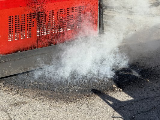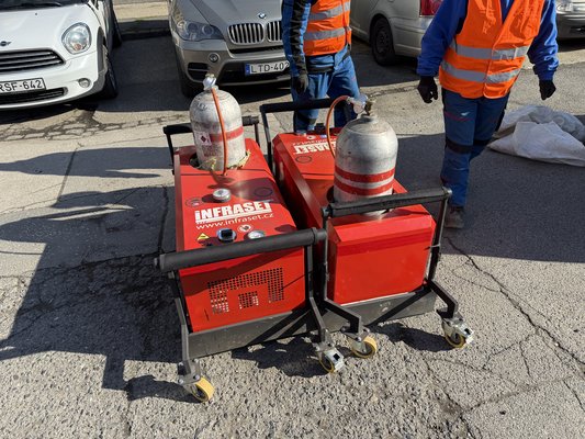 Kimentünk megnézni, hogyan javítanak meg egy 100x80 centis kátyút a harmadik kerület egyik forgalmas parkolójában. Az első, hogy le kell zárniuk az utat – persze ezt teljes szélességében nem tehetik meg, hiszen ők nem hatóság. A keletkezett kátyút kitakarítják, eltüntetnek belőle minden szennyeződést, majd fölé húzzák a két Infraset gépet. Ezek lényegében lefelé irányított gázlánggal felforrósítják a hibás felületet olyan mértékben, hogy megolvad az aszfalt. Szürreális látvány, ahogy 10-12 perc égetés után egy fém piszkavassal úgy kaparászták az aszfaltot, mintha zabkása lenne. A széttört felület szélét egy kicsit fel kell kaparni, hogy a beöntött javítóanyag egyenletesen feküdjön fel.
