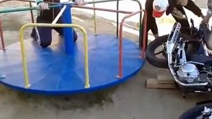 Totalbike videó 2014. 08. 07. 14:39 Légy hülye motorral, játszótéren Yamahával hajtani a forgóhintát talán nem a legjobb ötlet. Sokkal rosszabb vége is lehetett volna.