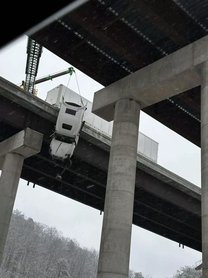 Hírek baleset 2025. 12. 04. 09:56 Öt órán keresztül, harminc méter magasan lógott egy kamionos egy hídról Egyelőre nem tudni, mi történt, de lényegében a rakomány mentette meg az életét.