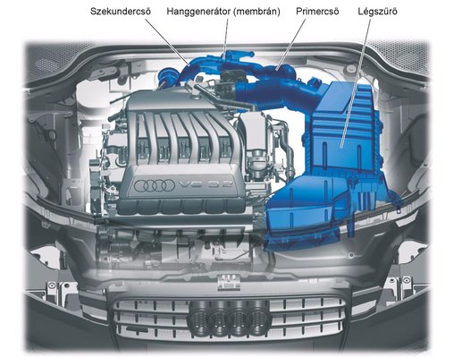 Az Audinál erre a hatásra erősítenek a hangolt csőrendszerrel. A szívórendszert az utastértől csak egy speciális, kúpos membrán választja el, ami a primer- és szekundercsövekkel együtt sávszűrőként viselkedik, s csak a fülnek kedves, kívánatos rezgéseket engedi át. Azokat azonban felerősítve, így ha a vezető kövér gázt ad, az anyós muff utas térdénél már ömlik is be a mellbevágó hangélmény.