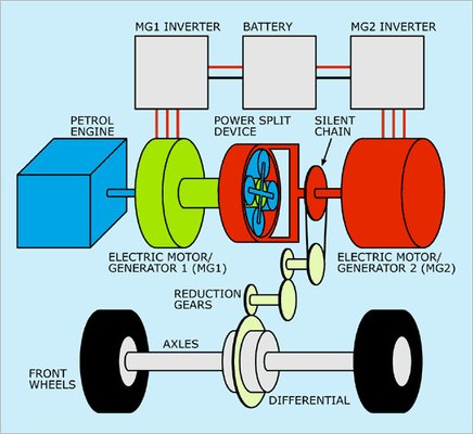 A hajtott kerekek a nagyobbik elektromotorral (MG2) vannak közvetlen kapcsolatban, míg MG1 a bolygómű napkerekéhez csatlakozik. Ez utóbbi látja el a hagyományos önindító és a generátor szerepét is.