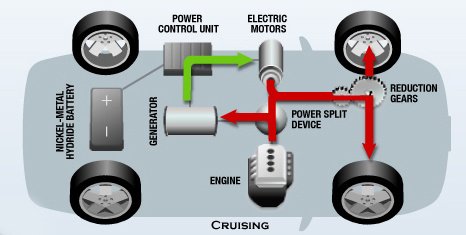 A benzinmotor és MG2 viszonyát tekintve részben párhuzamos hajtással van dolgunk, ahol a két erőforrás nyomatéka összeadódik. Másrészről a benzinmotor * MG1 * MG2 útvonalat követve egy soros hibrid architektúrája rajzolódik ki. E két hajtási rendszer változó arányban, de rendszerint egyidejűleg van jelen, ezért indokolt a power split hibrid (elágazó vagy osztott nyomatékú hibrid) megnevezés – olvasta Tom széles mosollyal az arcán.