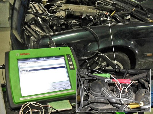 A BOSCH KTS 670-esen futó ESItronic program segítségével sikerült a csatlakozás, hisz egy kapcsolási rajz, és a műszerünk birtokában már csak néhány áthidaló drótot kellett közbeiktatni. A rögtönzött megoldás látványáért elnézést kérek. Néhányan korábban reklámozási szándékot véltek fölfedezni a cikkeimben, de szó sincs ilyenről, viszont én ezzel a műszerrel dolgozom, tehát erről tudok írni.