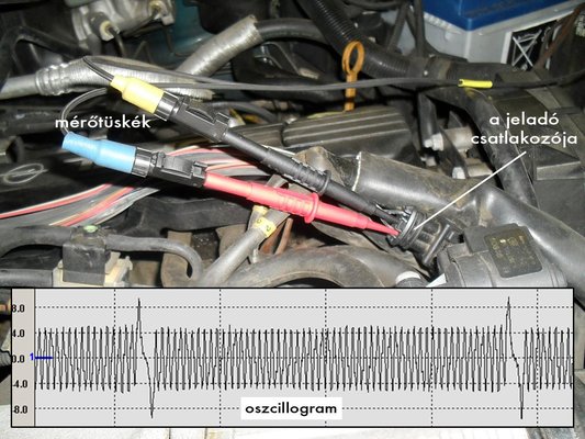 A referenciajel, amit a motorvezérlő a befecskendezés-kezdet, és az előgyújtás meghatározásához is használ, az oszcillogramon látható nyolcvoltos plusz-mínusz irányú feszültségkilengés (ez a két fogkihagyás). Az ábrán a két referenciajel között egy forgattyústengely-körbefordulást láthatunk. Ha valakinek van türelme, megszámolhatja a kisebb feszültség-kilengéseket, ez 58 darab, ami a póluskeréken az említett „fogak” számát jelenti.