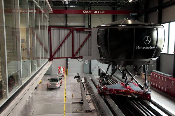Kérem, gyorsítson nyolcvanra! – hallom a hangszóróból. Lenyomom a gázt: mintha kicsit hátradőlne a kabin, furcsa, hányingerkeltő érzés. Kikerüléses feladat, próbálja ki, hogyan lehet sávot váltani különböző kormányáttételekkel – a barátságos hangnak egyelőre nem válaszolok, pedig tudom, nem csak látnak, hallanak is. Hoppá, a kanyarodás majdnem életszerű. Ilyenkor szánkázik jobbra-balra a hatlábú, ezzel létrehozza a szükséges oldalgyorsulást.