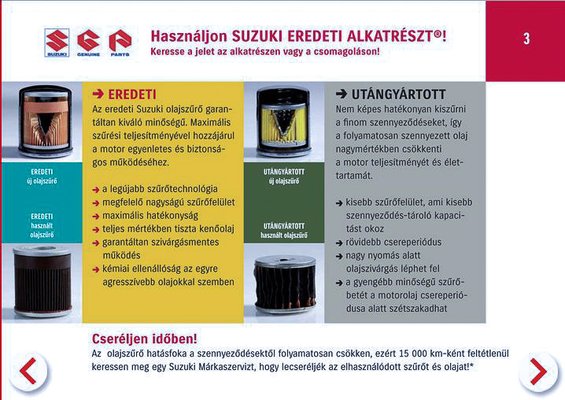 Írtunk már arról, hogy a Kia Motors milyen szépen belenyúlt a sárba a maga kis propaganda-irodalmával. Idén azonban a Suzuki fogott hasonló kampányba. Elég rosszul időzítve. Én például idén januárban botlottam bele a csinos kis füzetkébe, amikor éppen a lerohadó gyári lengéscsillapítókat cserélték az autón. Így csendben mosolyogva olvasgattam, milyen jó is, ha a gyári, eredeti alkatrészeket vásárolom meg sokat látott Swiftemhez.