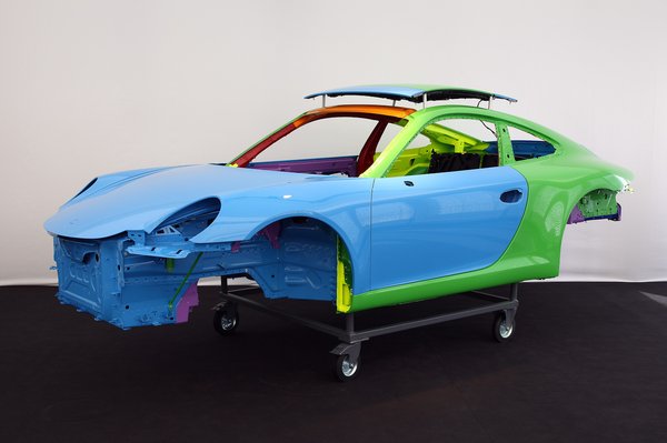 A közép- és kelet-európai újságíróknak a karosszéria és egyéb könnyűszerkezetű egységek bemutatásával kezdődött a móka. Nem túlzás azt állítani, teljesen új autót fejlesztettek Zuffenhausenban. A karosszéria vegyes építésű: alumínium lemez, alu öntvény és különböző szilárdságú acélok különleges keverékéből lesz a gyártósoron Porsche formájú váz. A tengelytáv nagyobb lett tíz centivel, a nyomtáv durván öttel.