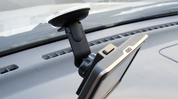 A szépen megcsinált készüléket egy relatíve rövid tartóval lehet a szélvédőre cuppantani. A csinos kis kart könnyű hurcolni, az ember leginkább le sem veszi a készülékről. Ha viszont a szélvédő erősen döntött, elég messze kerül az embertől a készülék, igaz, ekkora képernyőnél a leolvasás nem komoly probléma, csak a böködés.