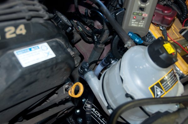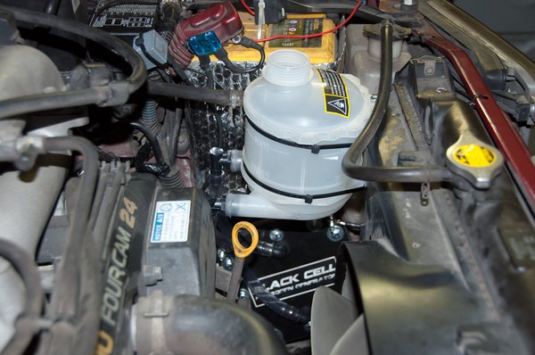 Jó pár órát elvacakoltunk a beszereléssel. Egyszerűnek tűnik a dolog, hiszen csak egy értelmezőszótárnyi HHO-generátort és egy befőttesüvegnyi tartályt kell elhelyezni, de a Tehén motortere messze nem annyira szellős, mint gondoltuk. Választásunk nem is volt, csak a bal oldali doblemez elejénél volt akkora tér, ahová elhelyezhettük a súlyos szárazcellát, a tartályt pedig minden aggályunk ellenére a hűtőventilátor terelőlemezéhez kellett rögzítenünk, máshol egyszerűen nem volt hely.